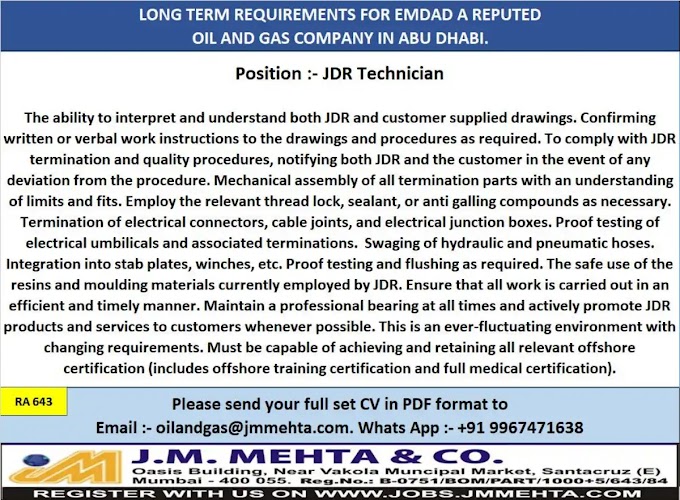 Job Opportunity: JDR Technician Position at Emdad Oil & Gas Company, Abu Dhabi